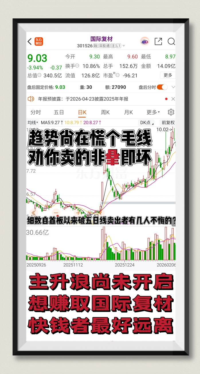 $国际复材(SZ301526)$ 好票真的需要捂,轻易不要下车,细数12月5日首板7.25以来的每一次跌破五日线,都是为了骗你手中的筹码,庄家忙活了月余是为了啥?仅仅是为了7.25后面的这点点价差???股市本就是考验人性,别人恐惧时你应该贪婪!!!再说外面其他票就一定安全?未必,时间是个好东东,股市没有神仙,静等后期走势验证