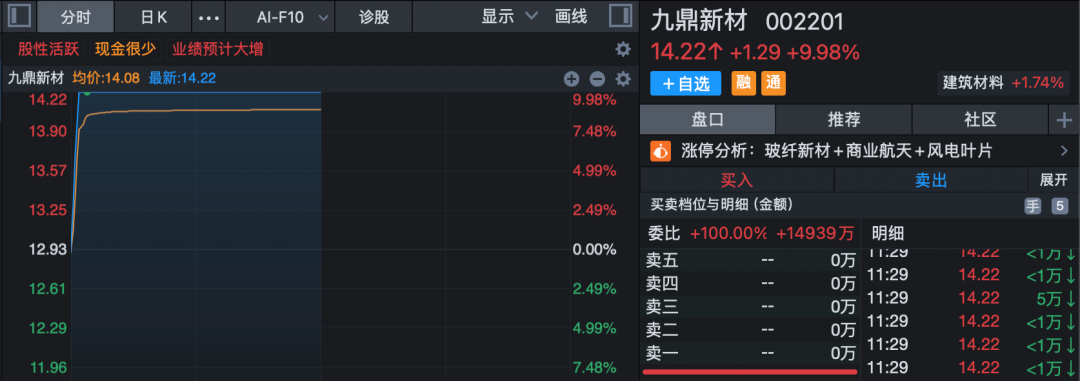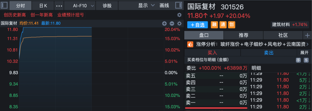玻璃玻纤概念股早间全线走强,板块指数大幅高开高走,盘中一度飙升逾9%,创历史新高。国际复材开盘仅约6分钟直线20%涨停,山东玻纤秒速涨停,九鼎新材仅约3分钟垂直涨停,中国巨石、宏和科技、中材科技等也均在10分钟内快速涨停。