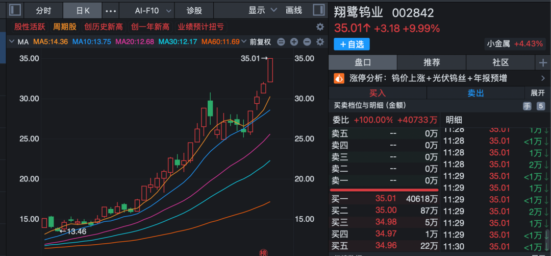 有色金属行业早间集体上攻,稀有金属方向领涨,板块指数放量大涨逾4%,连续第4日上涨。翔鹭钨业开盘仅约9分钟直线涨停,股价创历史新高(复权),今年以来累计大涨逾142%,浩通科技、东方钽业、章源钨业等也纷纷强势涨停或涨超10%。