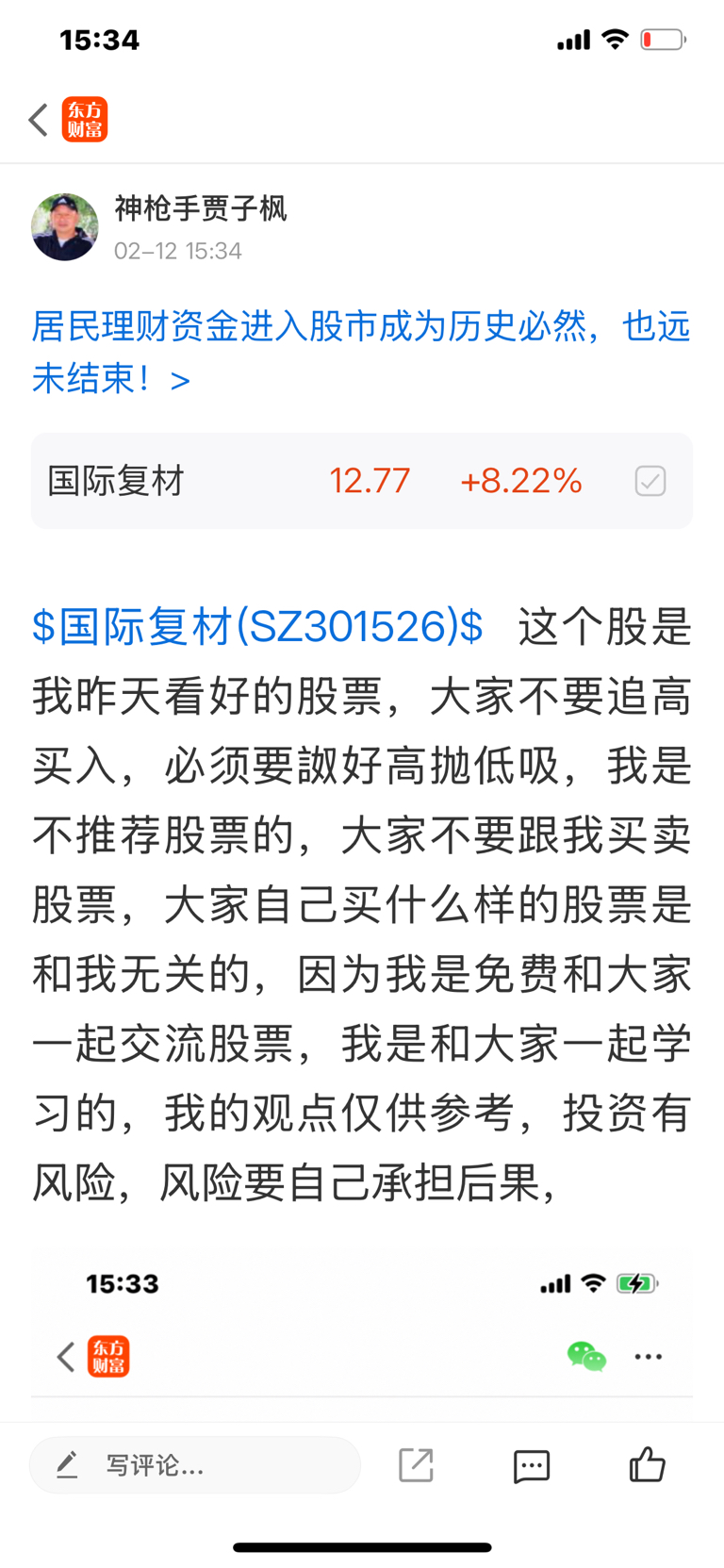 $国际复材(SZ301526)$ 这个股我是十一号发表文章看好的股票,大家不要追高买入,必须要做好高抛低吸,我是不推荐股票的,大家不要跟我买卖股票,大家自己买什么样的股票是和我无关的,因为我是免费和大家一起交流股票,我是和大家一起学习的,我的观点仅供参考,投资有风险,风险要自己承担后果,