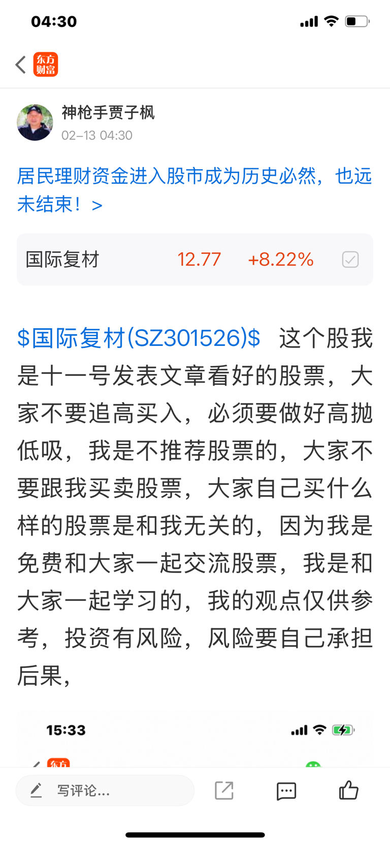 $国际复材(SZ301526)$ 这个股我是二月十一号发表文章看涨的股票,大家不要追高买入,必须要做好高抛低吸,我是不推荐股票的,大家不要跟我买卖股票,大家自己买什么样的股票是和我无关的,因为我是免费和大家一起交流股票,我是和大家一起学习的,我的观点仅供参考,投资有风险,风险要自己承担后果,