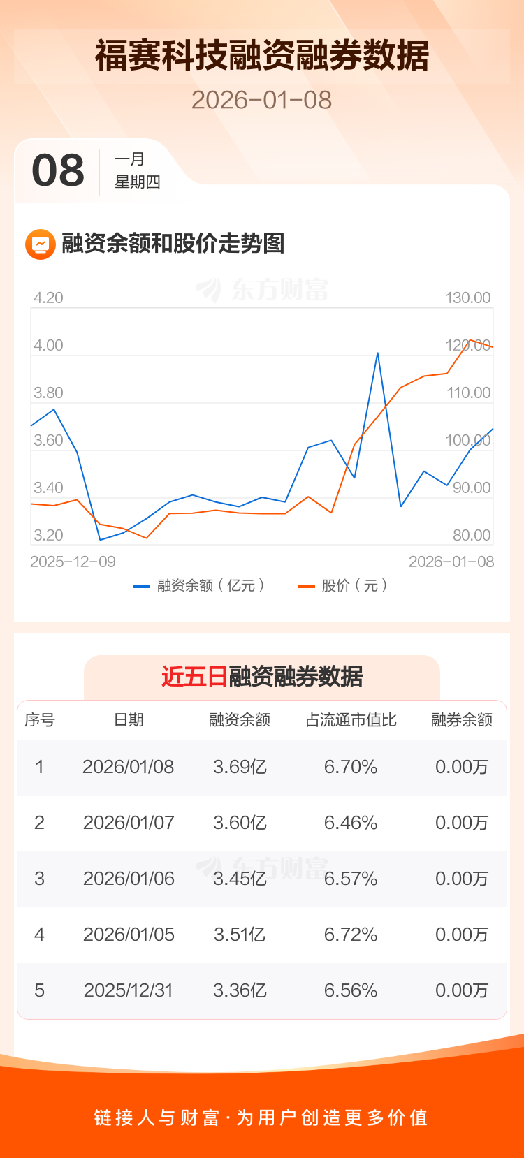 交易所最新数据显示,福赛科技于2026年1月8日获融资买入5355.50万元,融资偿还4472.00万元,当日融资净买入883.5万元。目前,该股融资余额3.69亿,占流通市值比例为6.70%。