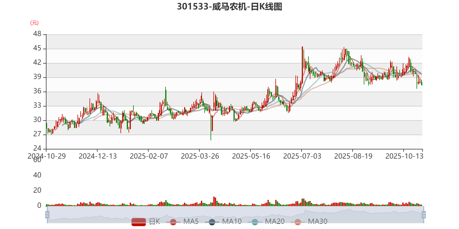 中证智能财讯威马农机(301533)10月29日披露2025年第三季度报告。前三季度公司实现营业总收入5.83亿元,同比下降17.43%;归母净利润3618.84万元,同比下降39.64%;扣非净利润3488.43万元,同比下降40.29%;经营活动产生的现金流量净额为-2452.66万元,上年同期为7246.41万元;报告期内,威马农机基本每股收益为0.369元,加权平均净资产收益率为3.18%。