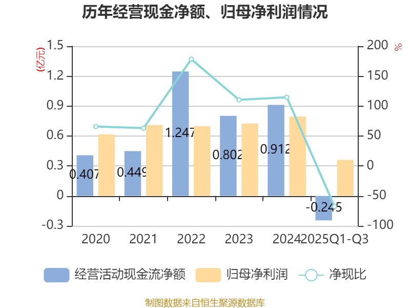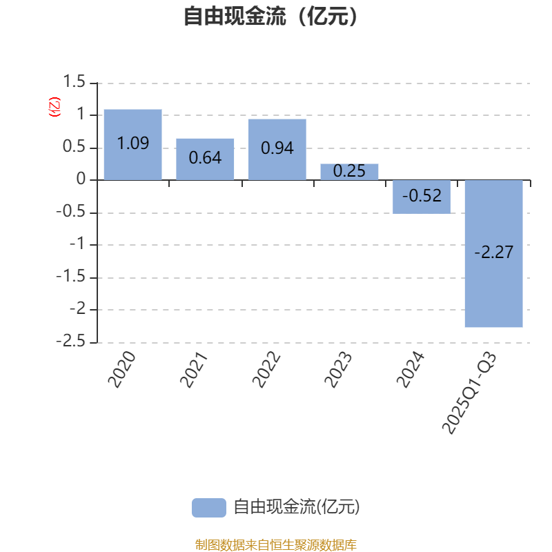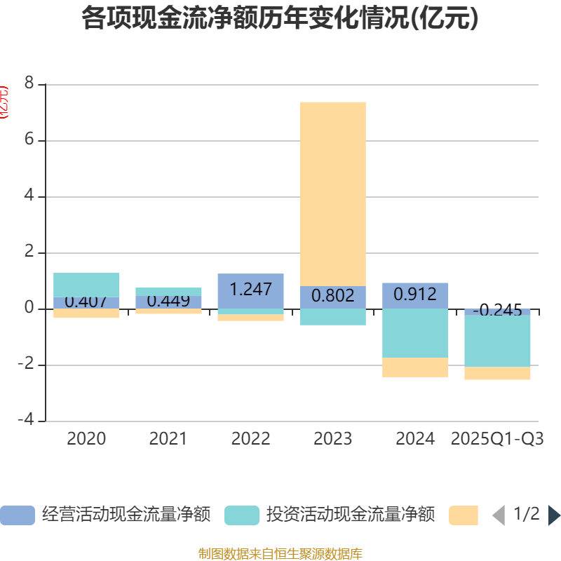 2025年前三季度,公司经营活动现金流净额为-2452.66万元,同比减少9699.06万元;筹资活动现金流净额-4519.37万元,同比增加2296.28万元;投资活动现金流净额-1.84亿元,上年同期为-2.28亿元。