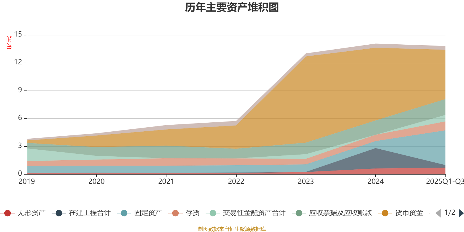 资产重大变化方面,截至2025年三季度末,公司固定资产较上年末增加390.74%,占公司总资产比重上升21.71个百分点;货币资金较上年末减少32.18%,占公司总资产比重下降17.24个百分点;在建工程合计较上年末减少87.75%,占公司总资产比重下降13.66个百分点;交易性金融资产合计占公司总资产的5.08%,上年末为0。