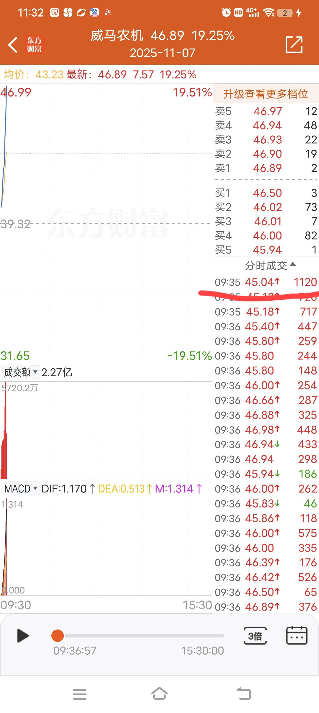 $威马农机(SZ301533)$ 再45.04元价格,谁扫货了1120万手,一把梭哈高达500万,现在收盘42元,亏了7%,中午收盘就亏了35万,野蛮人真是个狠人啊,下午收盘看能不能亏个80万,