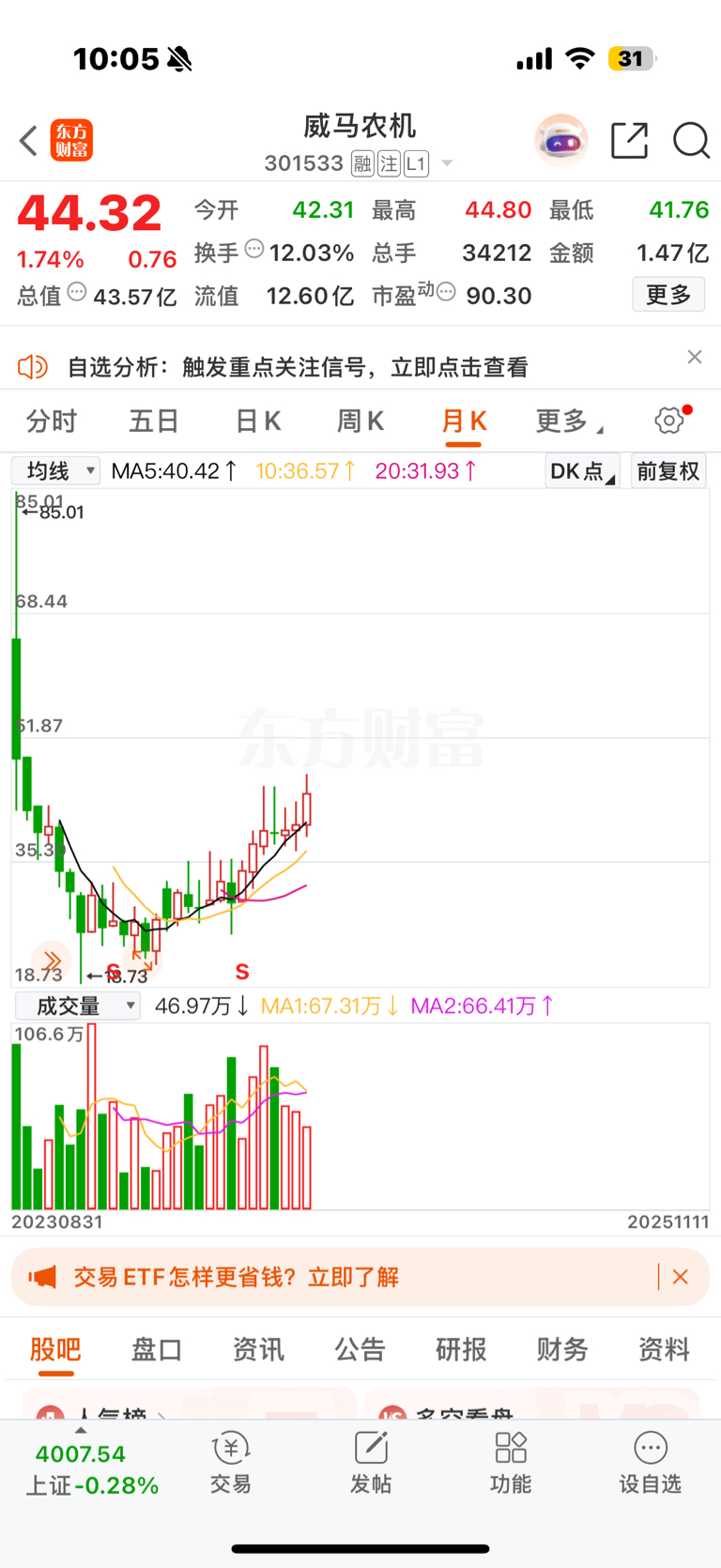 $威马农机(SZ301533)$ 天天叫出货的,你们是看不懂月线还是纯脑子有问题,这个位置出毛的货,早上深跌洗个盘这群chun货又高潮了