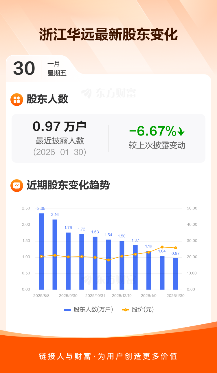 浙江华远最新披露数据显示,截至1月30日公司股东户数为9728户,较上期(2026年1月20日)减少695户,降幅为6.67%。户均持有流通股数量由上期的6120股上升至6557股,户均持股金额由上期的16.05万元增加至16.89万元。