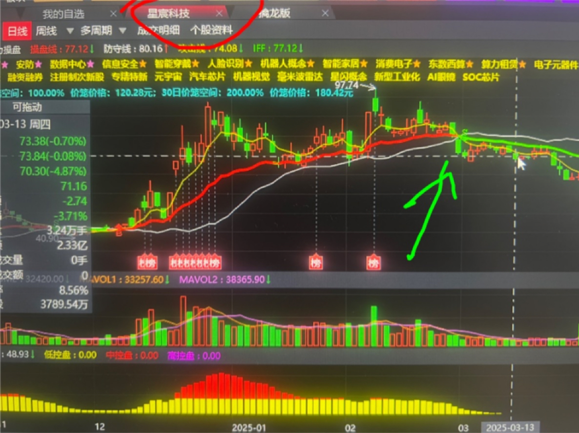 去年底、今年初一波炒作,翻了几倍。看那根粗红线,变成粗绿线,行情结束了,再看下面