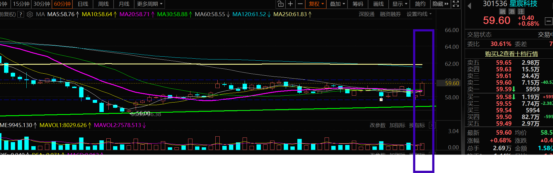最近持续调整,板块也势弱,下午略放量上涨以至于即将突破20日线,60分钟也有翘头之势!坐等打破箱体!