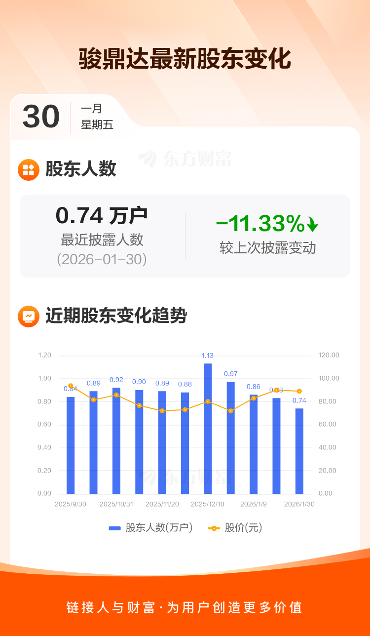 骏鼎达最新披露数据显示,截至1月30日公司股东户数为7362户,较上期(2026年1月20日)减少941户,降幅为11.33%。户均持有流通股数量由上期的3760股上升至4240股,户均持股金额由上期的33.86万元增加至37.75万元。