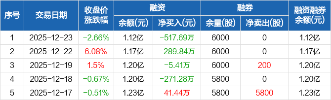 融资方面,当日融资买入1648.33万元,融资偿还2166.02万元,融资净偿还517.69万元,连续4日净偿还累计1084.23万元。融券方面,融券卖出0股,融券偿还0股,融券余量6000股,融券余额32.7万元。融资融券余额合计1.12亿元。