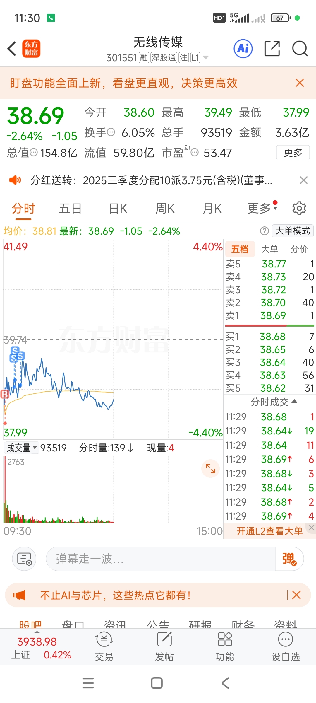 $无线传媒(SZ301551)$ 水平有点,但不多,38.27买,38.94卖,下午要是能到38附近我还买。