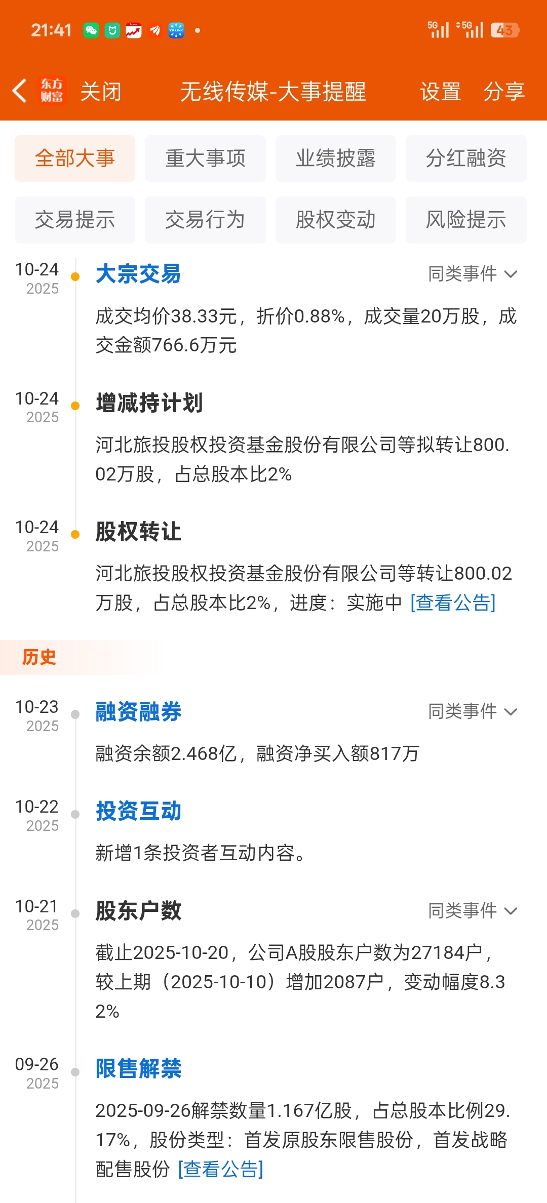9.26号限售解禁1.167亿股。然后河北旅投+康养集团询价共计转让800万股,最近不断有折价0.88%大宗交易。这个股董事局活跃过于异常了。大家分析分析是大利空。还是主力和董事配合演双簧逼迫散户交出带血筹码?