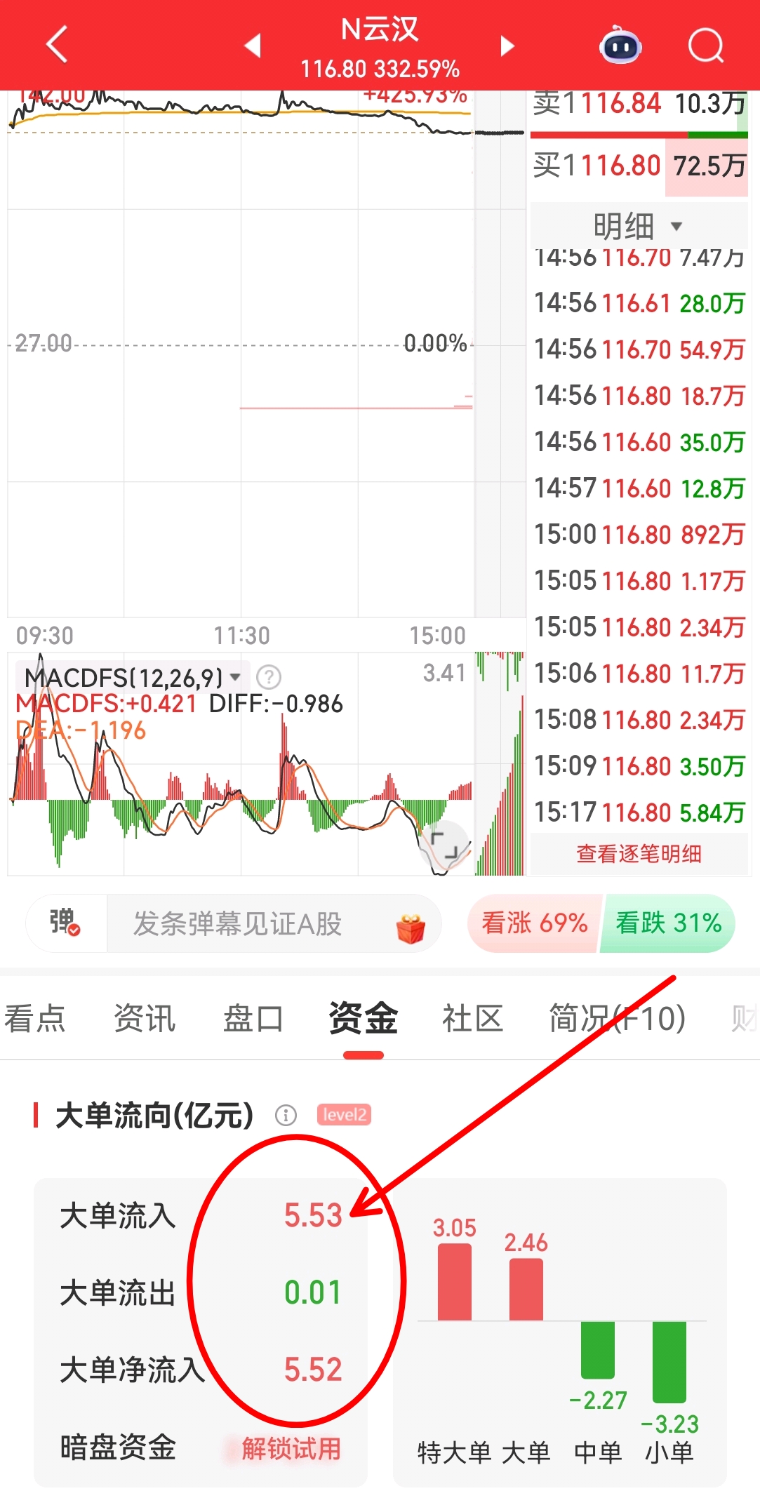 $N云汉(SZ301563)$ $西普尼(HK|02583)$ $Spruce Biosciences Inc(NASDAQ|SPRB)$ 大a新股,港股新股,美股新股,最近流行百元新股出大妖啊关键云汉还叠加芯片板块,市场唯一无涨跌幅限制芯片概念股,只有16亿流通,这股真要低开十多个点,会不会被抢疯?关键第一天就进了占全天成交量40%的5.52亿大单资金会给我们机会么低吸么?