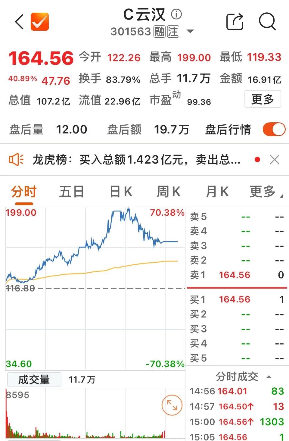 截至收盘,C云汉报164.56元/股,涨幅40.89%,当日成交16.91亿元,换手率83.79%。
