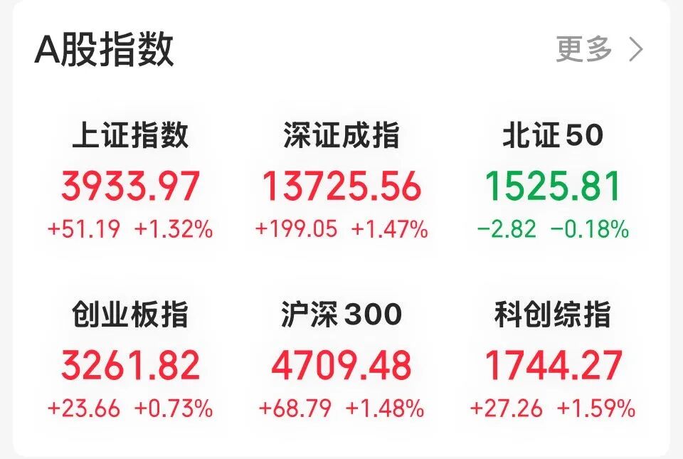 截至收盘,上证指数报3933.97点,涨1.32%,刷新2015年8月以来新高;深证成指报13725.56点,涨1.47%,刷新2022年2月以来新高;创业板指报3261.82点,涨0.73%,刷新2022年1月以来新高。