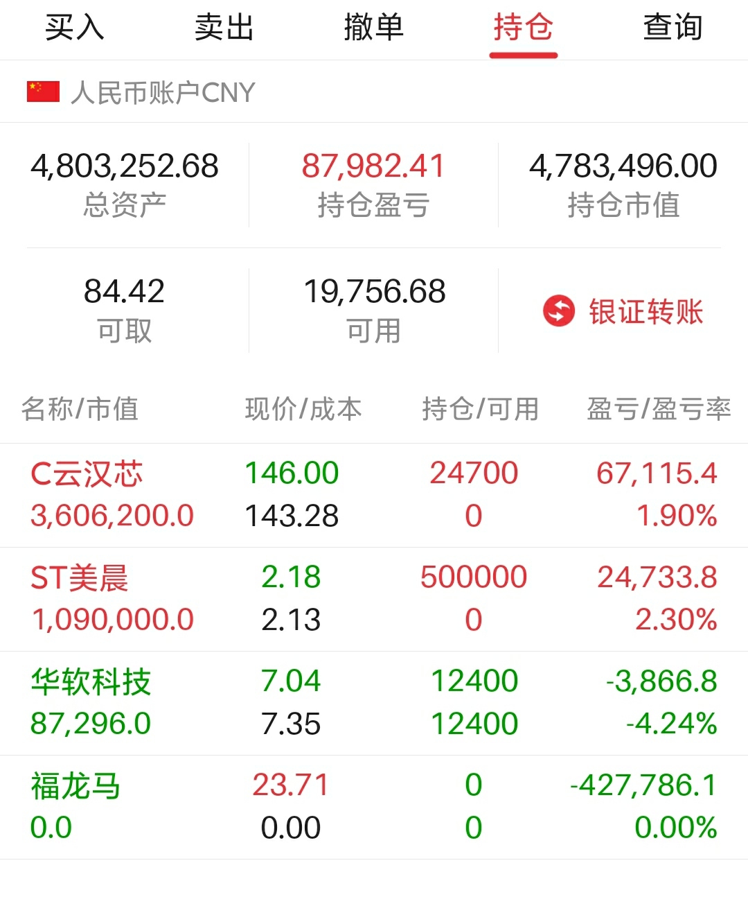 $C云汉(SZ301563)$ $ST美晨(SZ300237)$ $福龙马(SH603686)$ 割肉福龙马,满仓介入云汉芯城和美晨科技了!看看云汉芯城名字就是高大上!后市必破300元!大家看看我的持仓单截图,进来讨论一下后市操作!