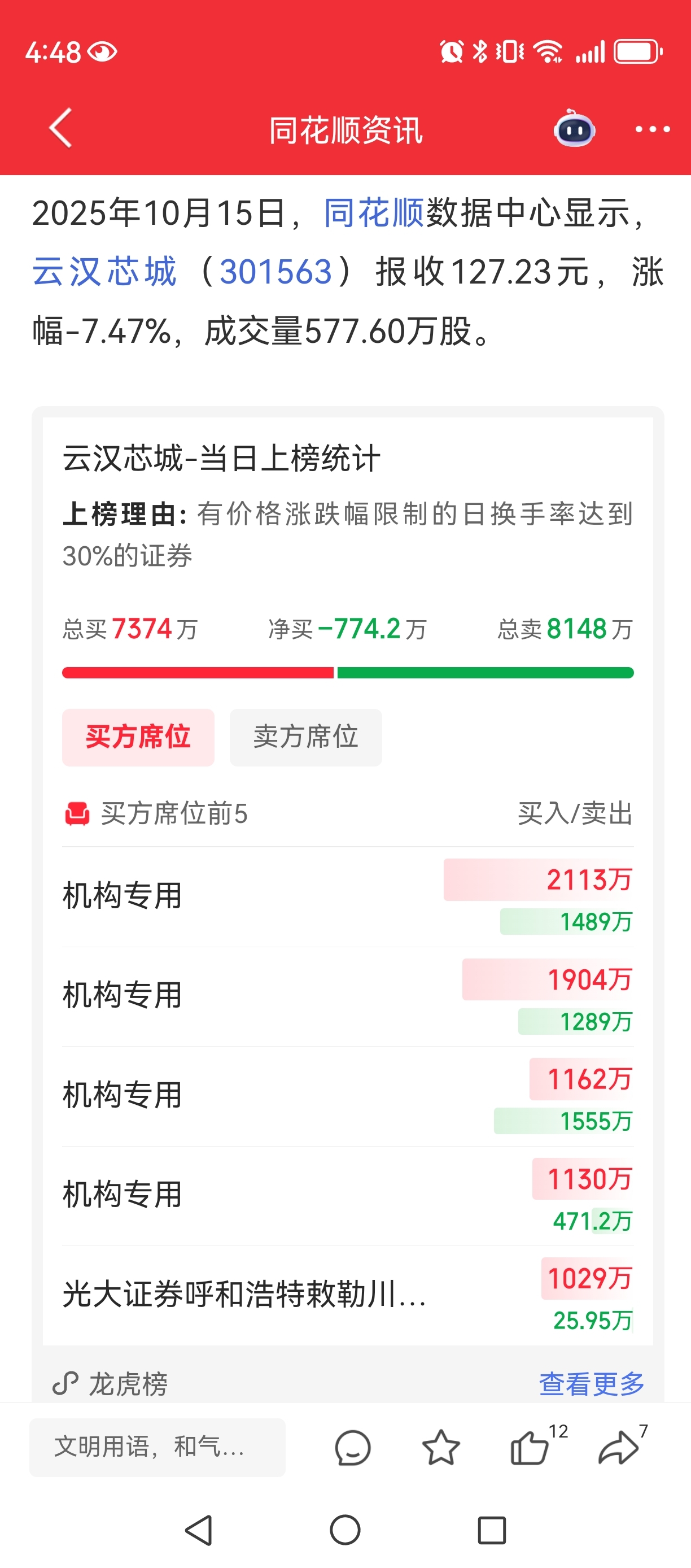 现在,超威半导体,上涨4.3%。云汉芯城,今天龙虎榜机构买了这么多。原来以为有拉