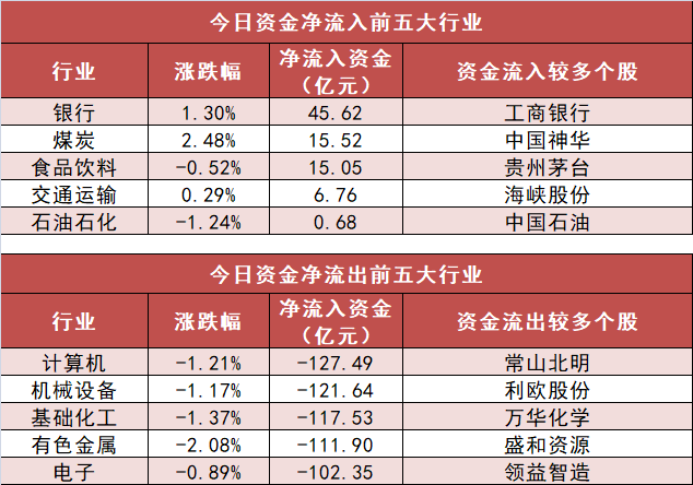 申万一级行业中,5个行业实现资金净流入,其中银行业净流入45.62亿元居首。