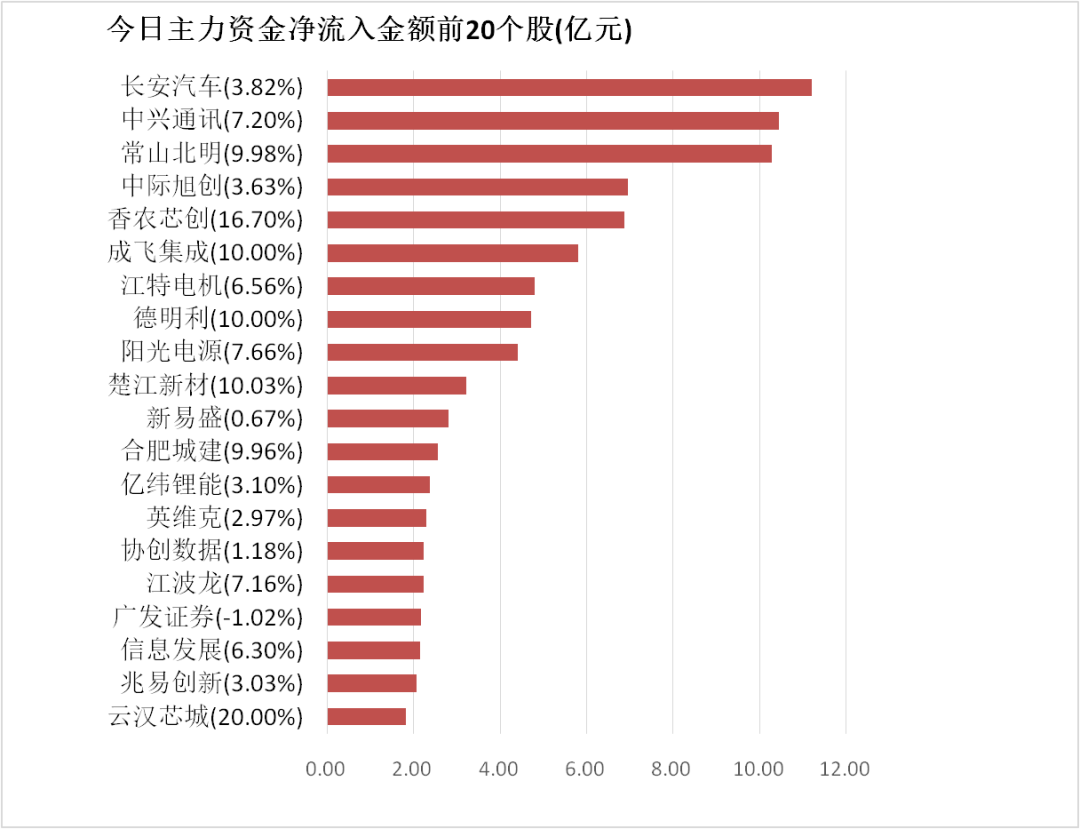 4.长安汽车主力资金净流入11.2亿元居首