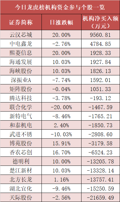 盘后龙虎榜数据显示,机构现身多股,其中云汉芯城等股票呈现机构资金净买入,天际股份等股票呈现机构资金净卖出。