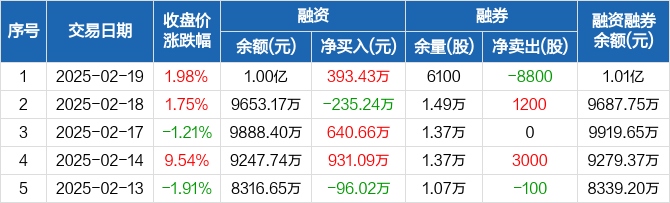 中仑新材:融资净买入393.43万元,融资余额1亿元(02-19)