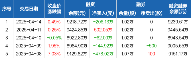 中仑新材:融资净偿还206.13万元,融资余额9218.72万元(04-14)