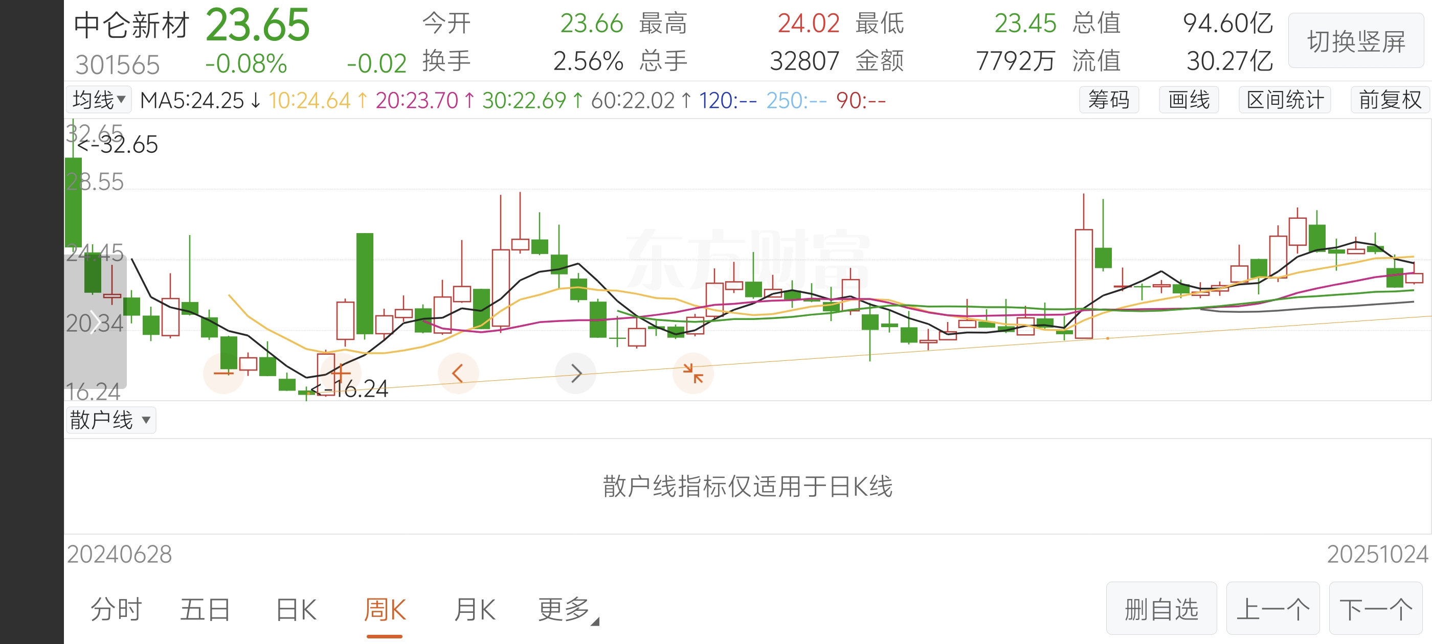 $中仑新材(SZ301565)$ 还有十个点左右的跌幅才到支撑位,从最近的放量下跌看主力也是想往下打,21.5左右再看看要不要买入了