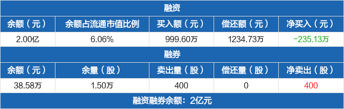 融资方面,当日融资买入999.6万元,融资偿还1234.73万元,融资净偿还235.13万元,连续4日净偿还累计779.38万元。融券方面,融券卖出400股,融券偿还0股,融券余量1.5万股,融券余额38.58万元。融资融券余额合计2亿元。