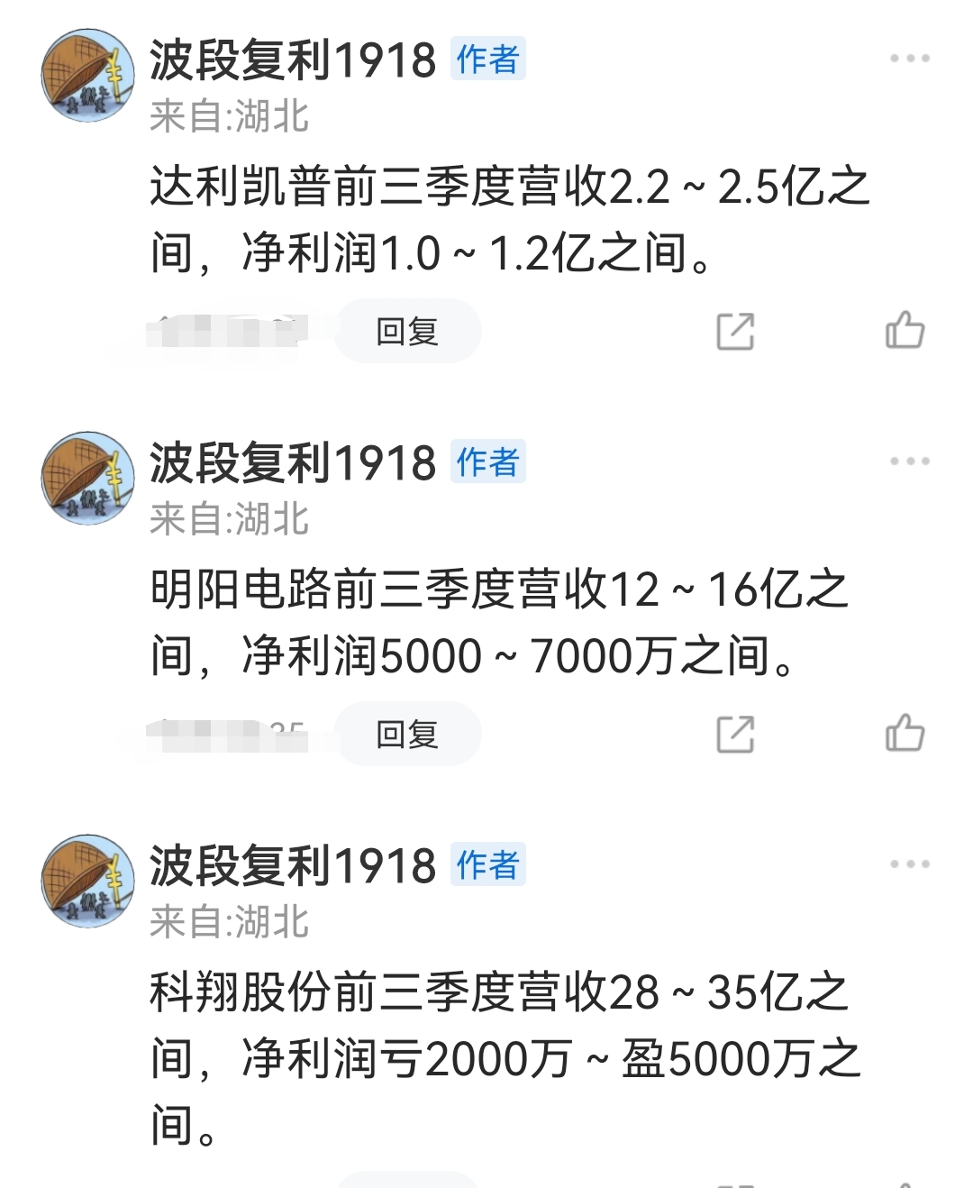 三剑客季报倒计时:个人预测营收与利润(如有雷同实属巧合)$达利凯普(SZ301566)$ $明阳电路(SZ300739)$ $科翔股份(SZ300903)$