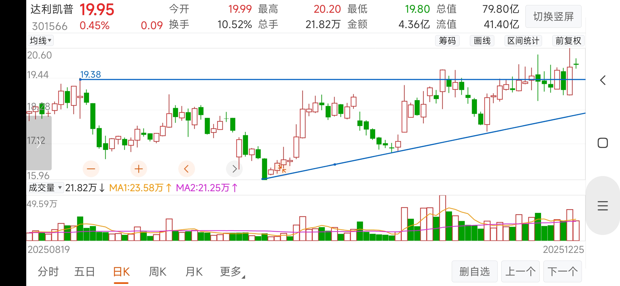 $达利凯普(SZ301566)$ 之前几次突破压力线后,第二日都回至线下,但今日不同,昨突破后,今天缩量小阳稳居线上,于是压力线翻成支撑线,明天大阳伺候。如仍小阴阳,只要收盘在线上就好。洗洗会涨更多。