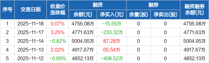 贝隆精密:融资净偿还15.55万元,融资余额4756.08万元(11-18)