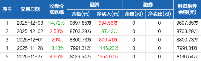 贝隆精密:融资余额9697.85万元,创近一年新高(12-03)