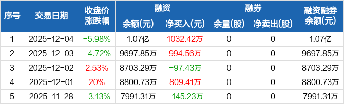贝隆精密:融资余额1.07亿元,创近一年新高(12-04)
