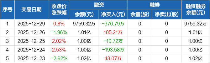 贝隆精密:融资净偿还376.79万元,融资余额9759.32万元(12-29)