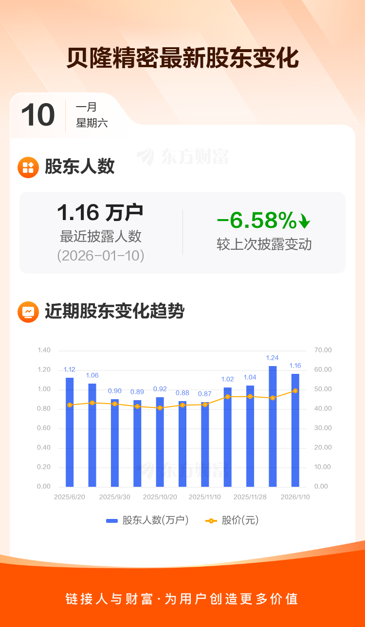 贝隆精密:截至1月10日最新股东户数1.16万户,较上期减少6.58%