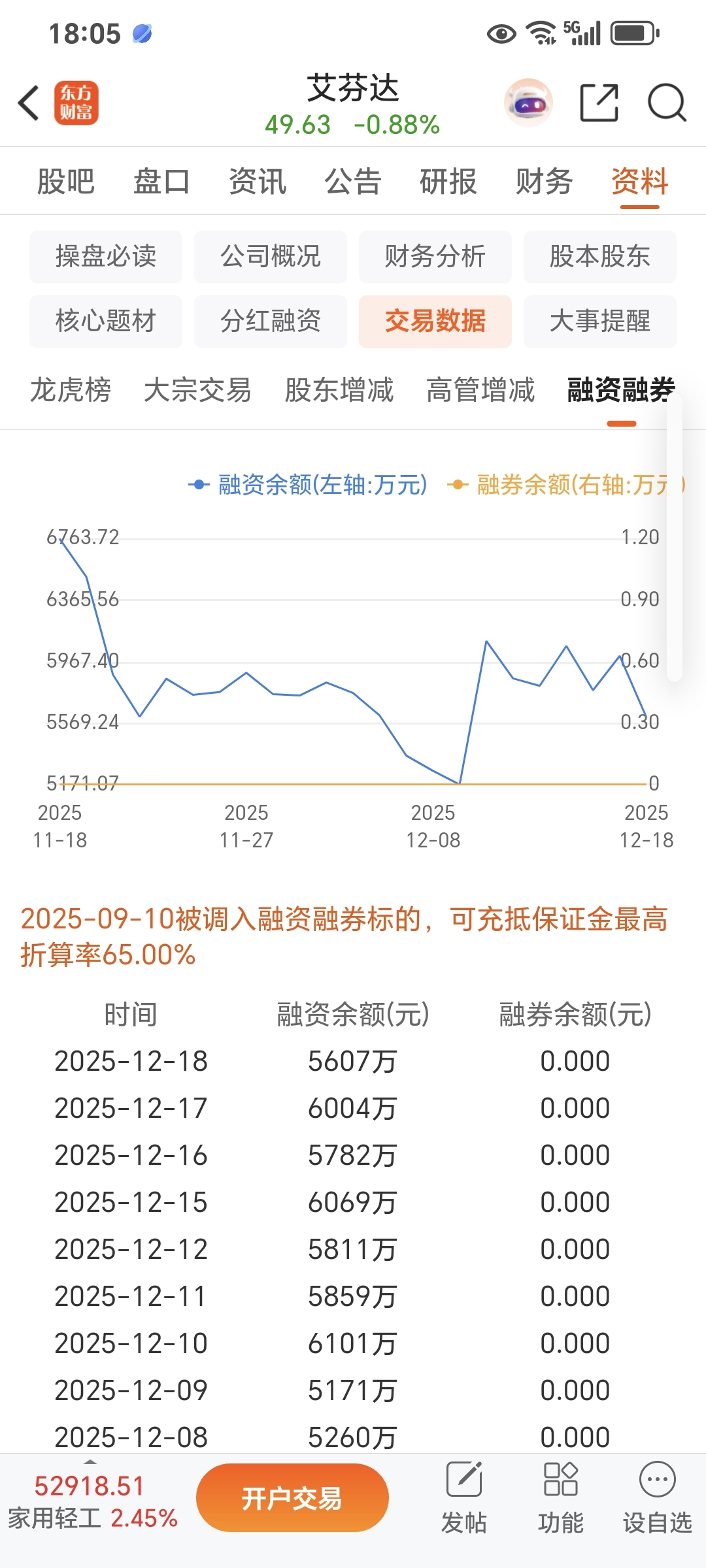 $艾芬达(SZ301575)$ 今天显示,昨天融资资金又少了400万,周一九点开盘前看今天融资数据了!