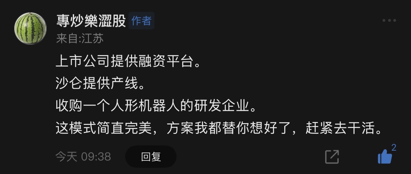 所以个人感觉,应该会通过这个子公司并购一个较为成熟的人形机器人公司,这个公司和沙仑一起研发,生产。