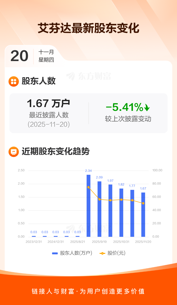 艾芬达:截至11月20日最新股东户数1.67万户,较上期减少5.41%