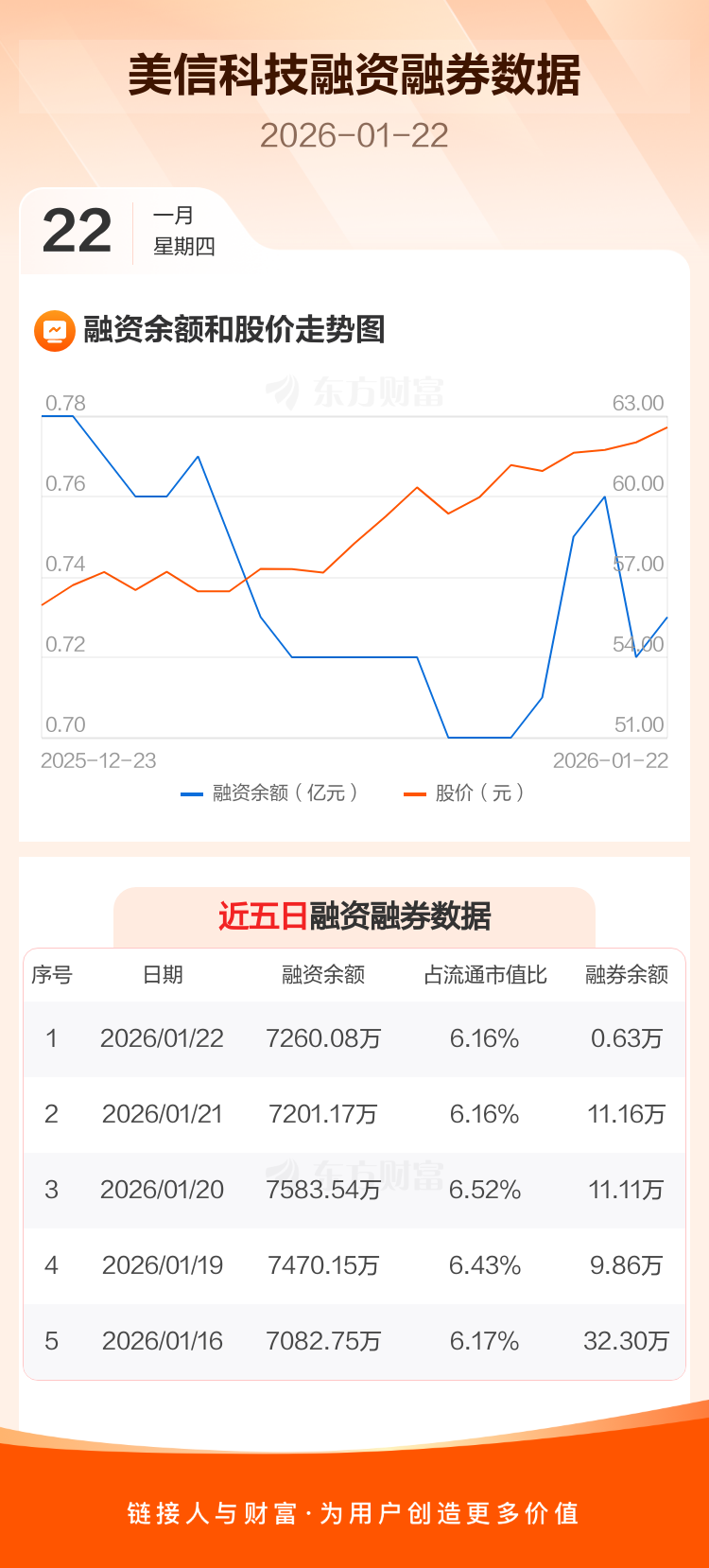 交易所最新数据显示,美信科技于2026年1月22日获融资买入390.36万元,融资偿还331.45万元,当日融资净买入58.9万元。目前,该股融资余额7260.08万,占流通市值比例为6.16%。