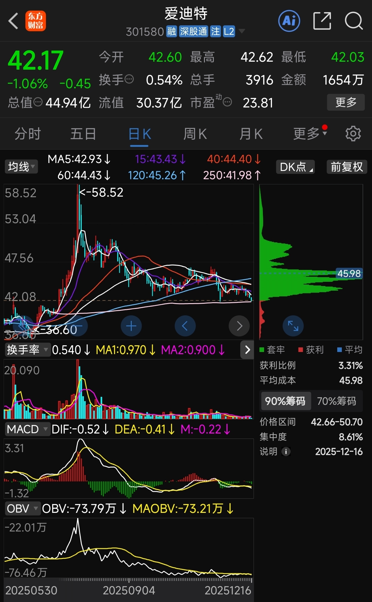 $爱迪特(SZ301580)$ 获利盘仅剩不到一个亿了,主力够凶恶,一旦转为上涨必然令曾经持仓的小散拍断大腿。