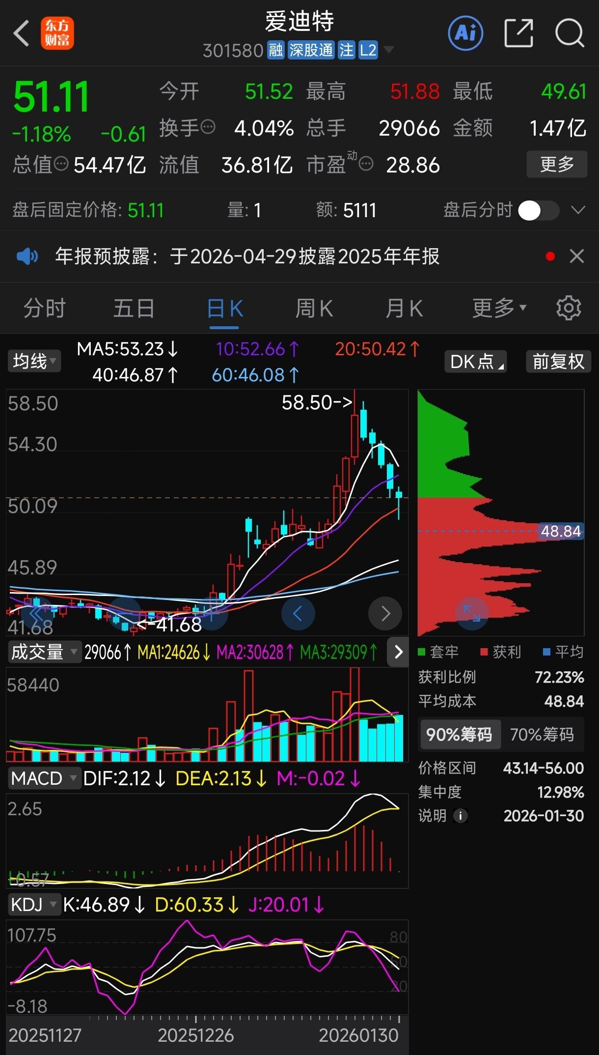 $爱迪特(SZ301580)$ 最近一个多月的上涨,以5个小浪冲上筹顶,第5浪草草了事,说明主力并无立即大幅拉升的意图。主力意图是什么?使上涨前那一坨套牢筹码经由二次打击崩溃下落。这样的话,调整或许需要半年。除非快速打落到筹底能转化为V字反转,调整周期能缩短,但是在牛市里面是很难做到的,因为打压太难。