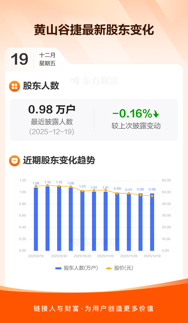 黄山谷捷最新披露数据显示,截至12月19日公司股东户数为9803户,较上期(2025年12月10日)减少16户,降幅为0.16%。户均持有流通股数量由上期的2036股上升至2040股,户均持股金额由上期的9.71万元减少至9.55万元。