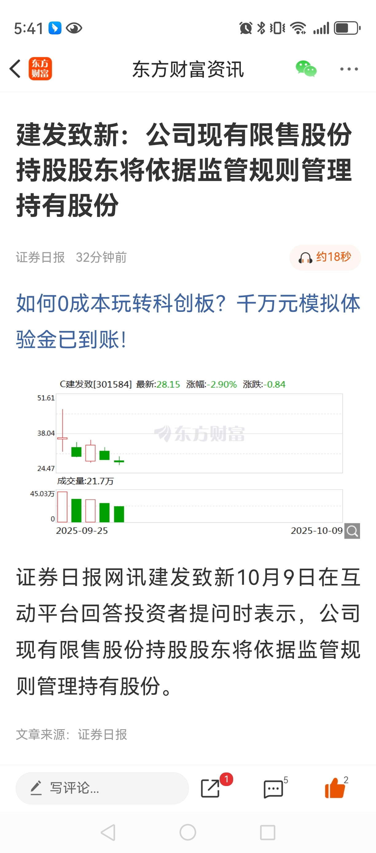 建发致新,公司大股东严格遵守规定不会卖出股票,流通盘只有一点点,调整2天,明天开