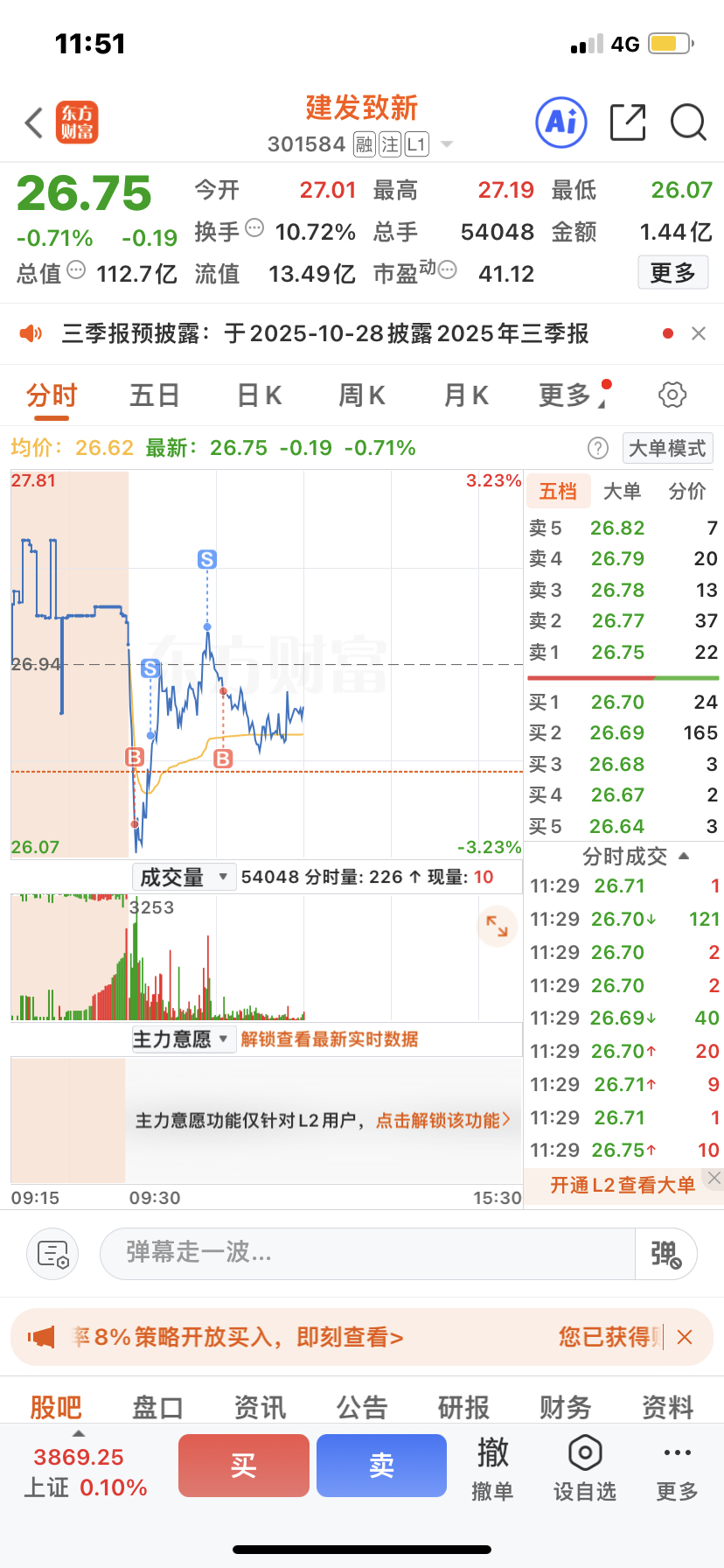 $建发致新(SZ301584)$ 持股第4天,1.5层仓,26以下加到3层仓
