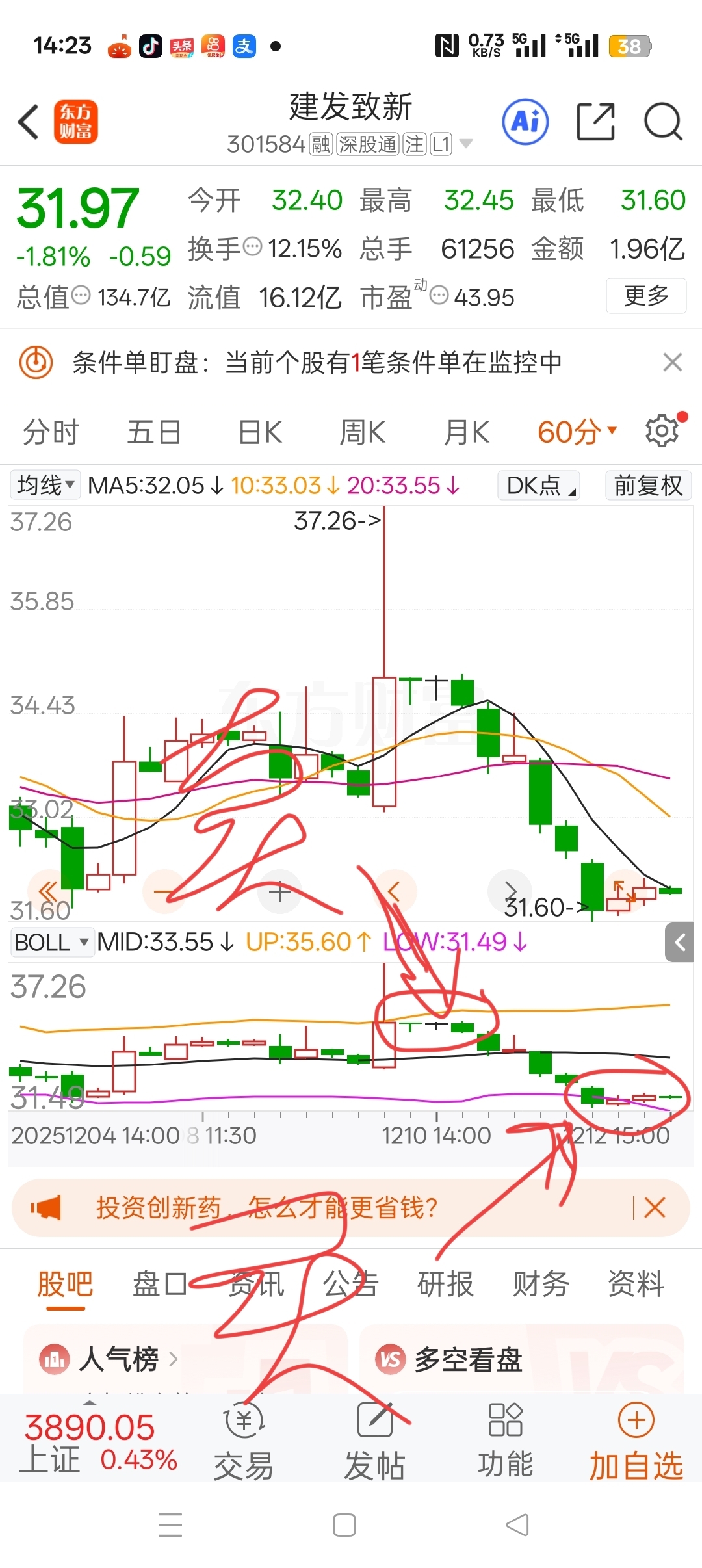 看着这个布林线,如果上边红圈处应该是卖出,下边红圈处就应该是买入,不知道我这么判