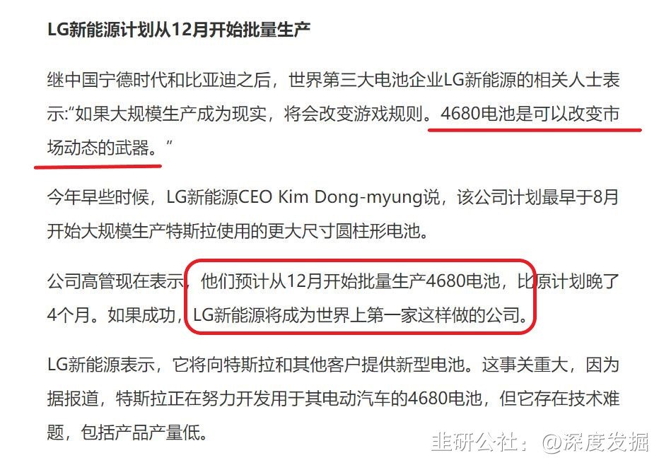 预计12月开始批量生产4680电池,LG新能源将是世界第一家量产的公司;