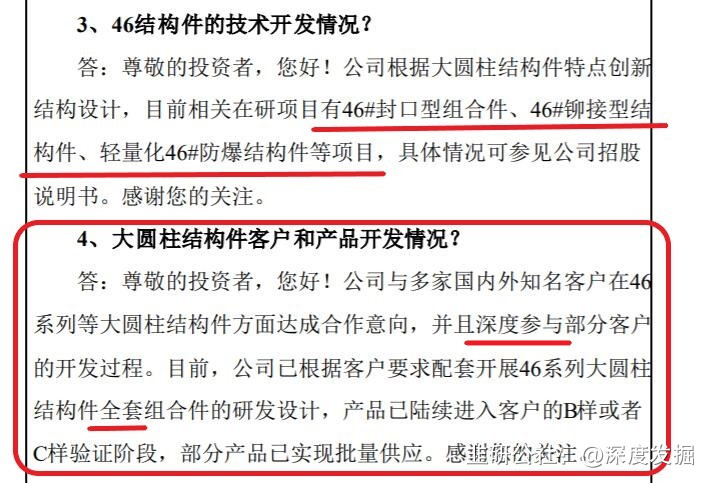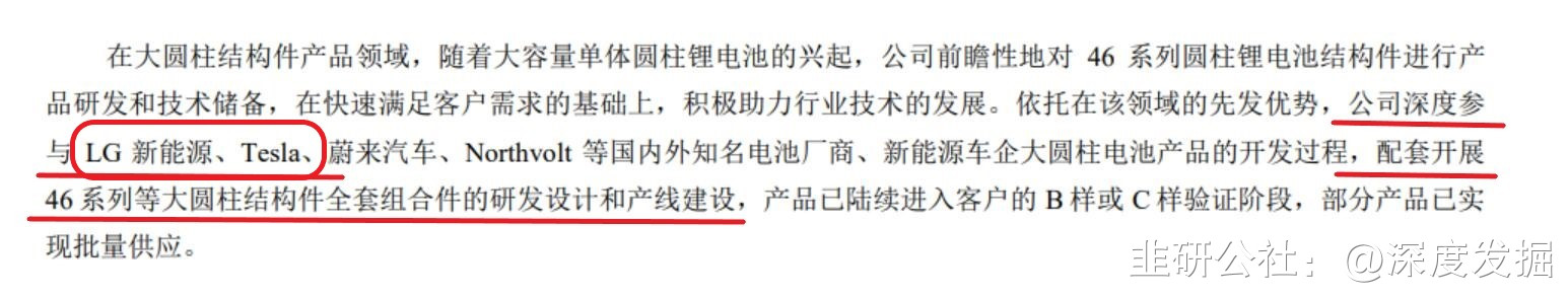 最新的公司调研信息:公司深度参与LG新能源,特斯拉46系列大圆柱系列结构件全套组合件的研发设计,产品陆续进入客户B样和C样验证阶段,部分产品已实现批量供应。