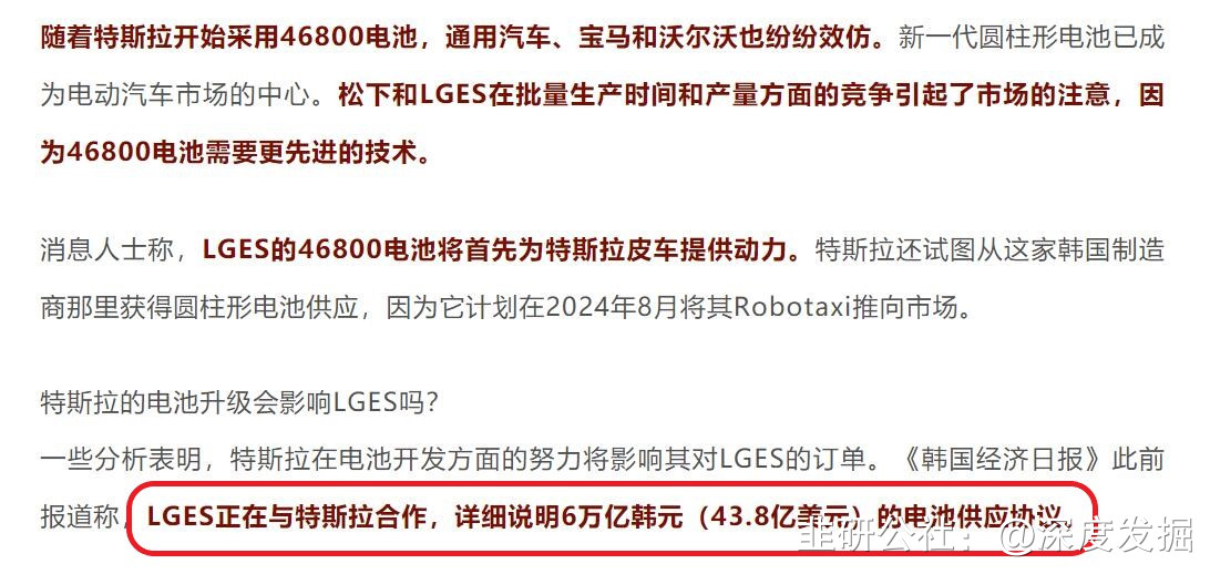 LG新能源与特斯拉合作,双方拥有价值43.7亿美元的电池供应协议。